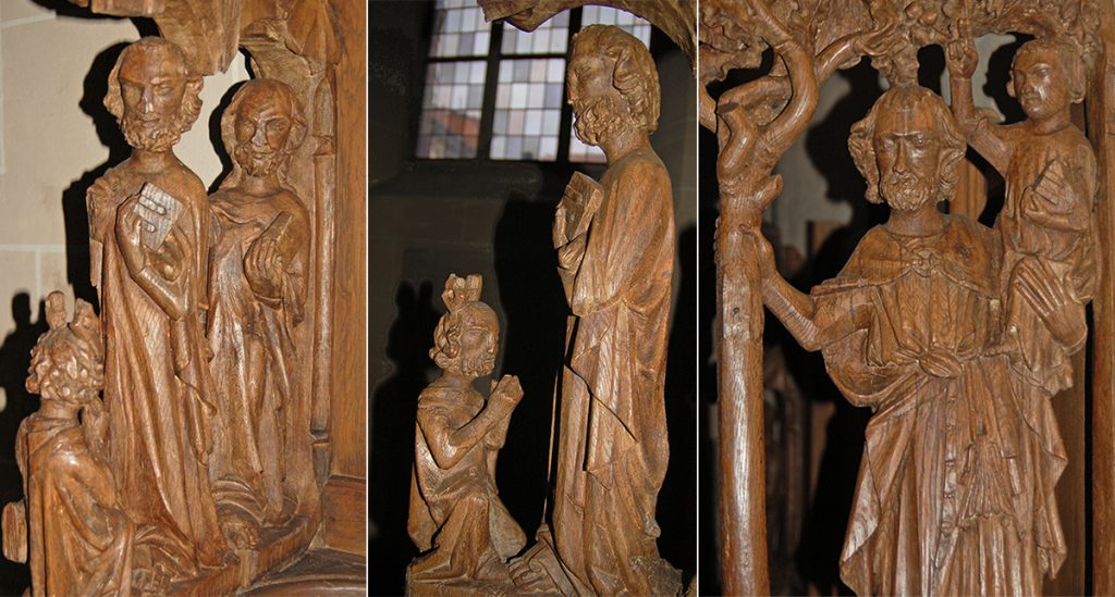 Figuren am Chorgestühl links von der Chortreppe: an der linken Wange ein vermutlich vor Petrus und Paulus kniender Büßer, an der rechten Wange der heilige Christopherus mit jungem Jesus Bilder: Peter Fendrich