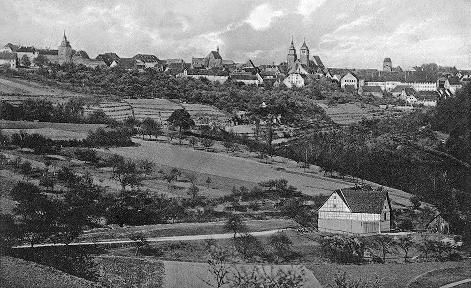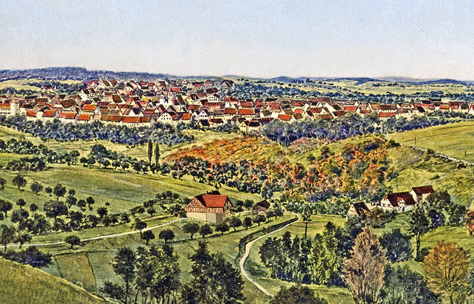 – Wo die ehemalige Siedlung Aichholz vermutet wird, ließen sich der Leinenweber Johann Balthas Raiser, Sohn des Webers Christian Raiser aus Möglingen, und seine am 15.8.1769 geheiratete erste Gattin Eva Maria nieder. Sie war eine Tochter von Johann Michael Gerstle, Zunftmeister der Schuhmacher in Markgröningen. In welchem Jahr das Gehöft auf württembergischen Grund erbaut wurde, ist nicht überliefert, vermutlich um 1770. |
