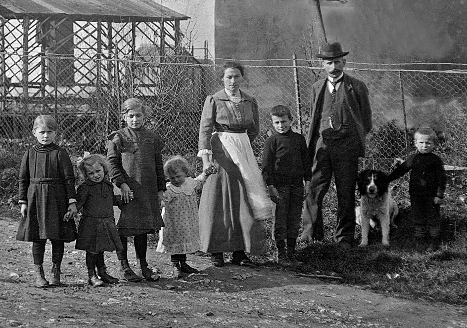 a Familie Fiedler 1917 im Raiserhof (Ausschnitt). Von links: Else (∞ Kienle), Hedwig (∞ Gayer), Anne, Gertrud (∞ Ohnmacht), Anna (geb. Gayer), Otto, Karl und Rudolf. Hildegard und Hermann waren noch nicht geboren. – – |