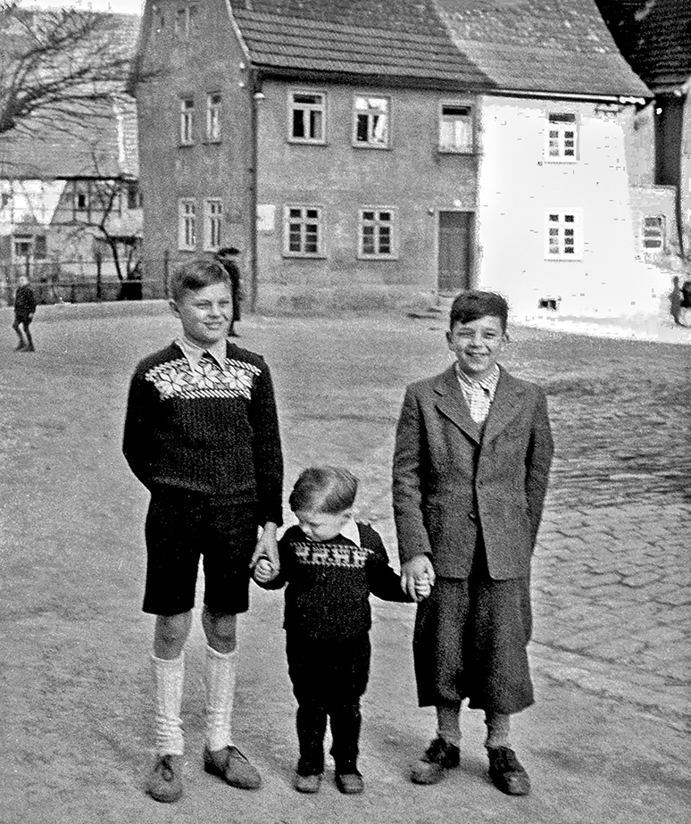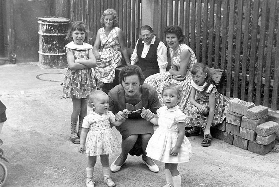 Sonntagmorgen-Treffen am Hausbänkle während Bauarbeiten an Kirchplatz 4 um 1960. Vorne Hilde Leix, hinten in der Mitte „Tante Rosa“, die Kindergottesdienst hielt. |
