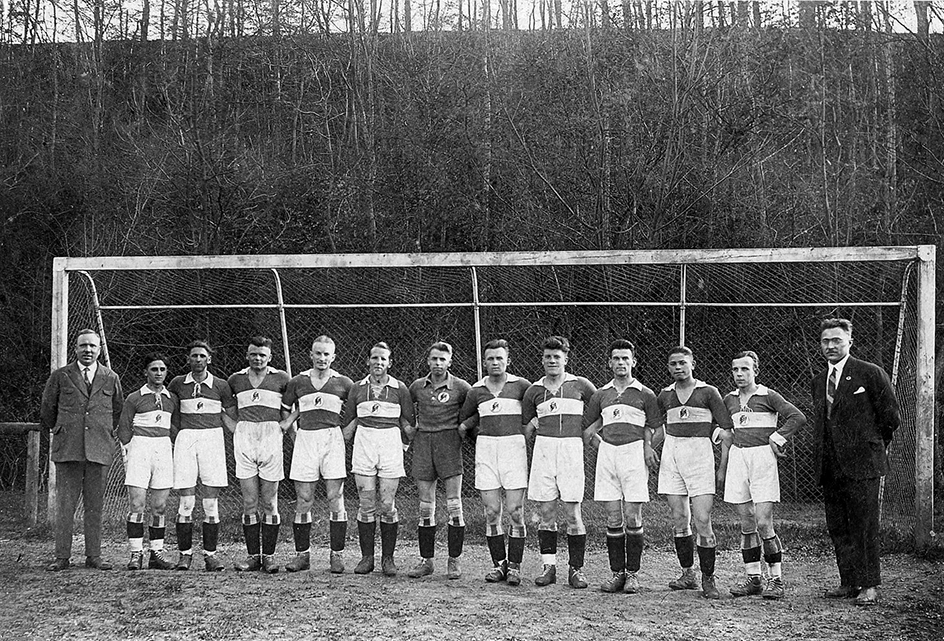 FVM- und Gastmannschaft um 1931 vor der Baracke des Arbeiter-Sportvereins, die 1927 östlich vom Clubhaus des FVM errichtet wurde |