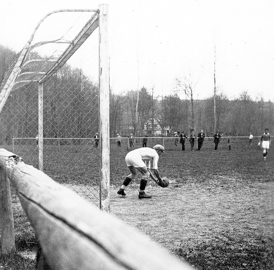 Spielszene aus den 1930er Jahren: „Tor”, eingekratzt ins Negativ. Am linken Bildrand Hermann Raff. Bemerkenswert ist die hohe Zahl an Zuschauern hinter den Holzschranken. |