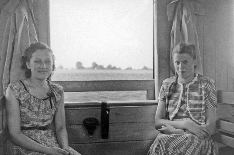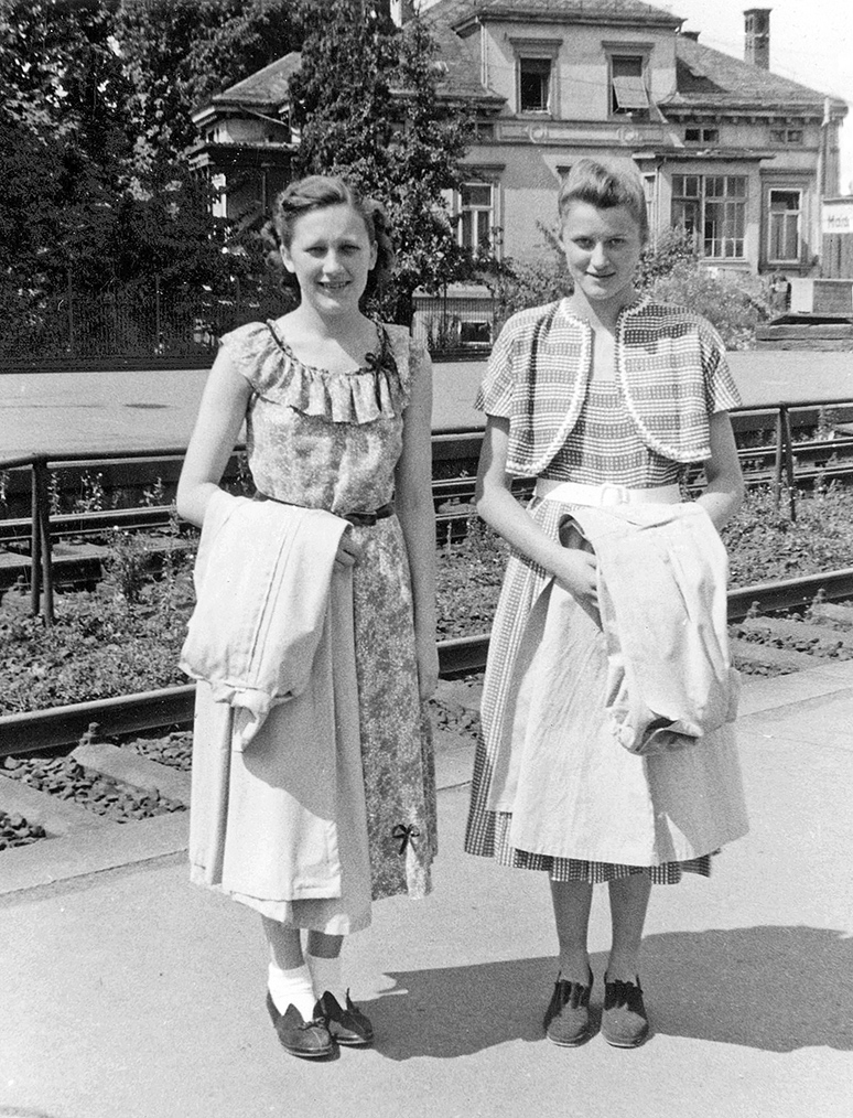 Ilse Leix und Lieselotte Supp 1951 im Gröninger Zügle. Um die schweren versenkbaren Fenster der Plattformwagen zu schließen, zog man sie mit einem Lederriemen nach oben. |