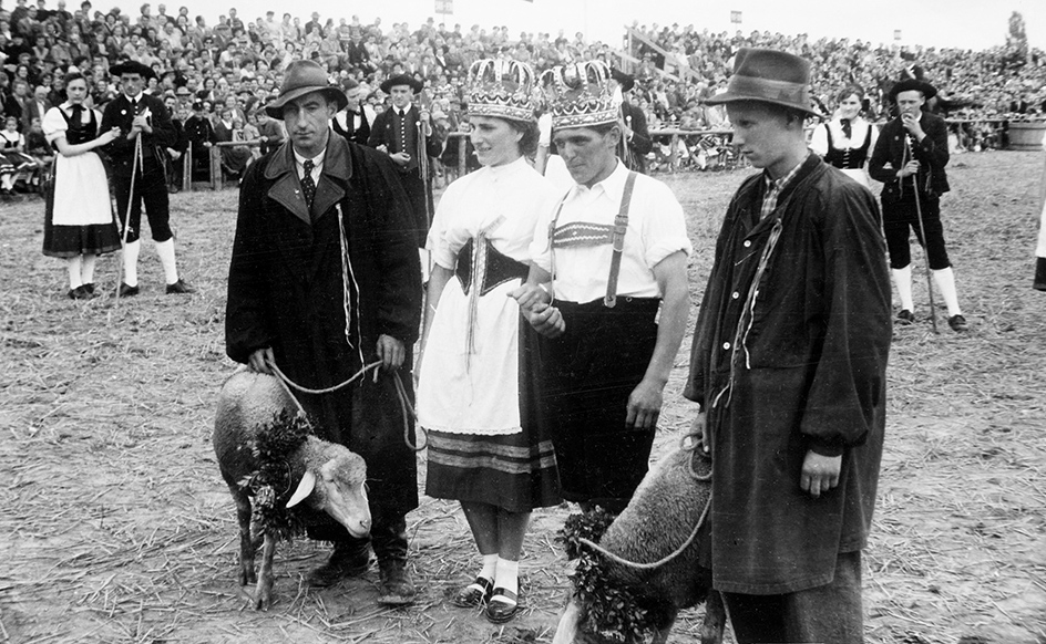 Das Königspaar 1951 mit Hammel und Schaf als Preis: Marianne Frick aus Bissingen/Teck und Christian Baisch aus Hopfenburg