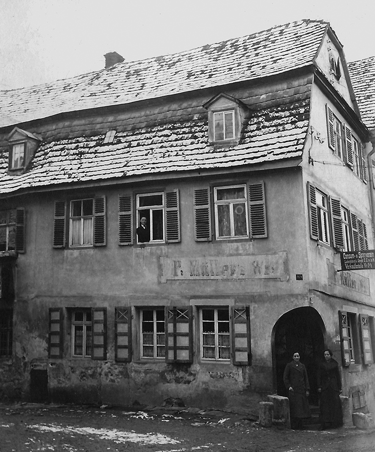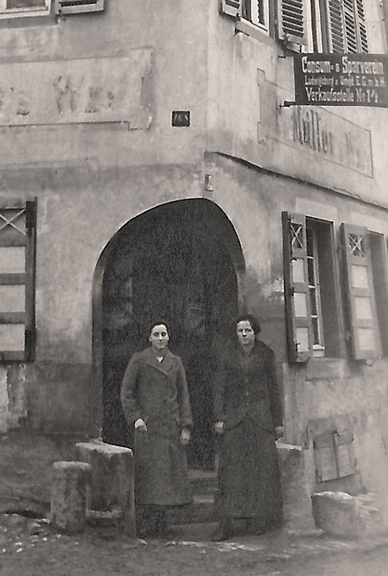 Emma Kohler und NN Etzel um 1920 vor der Verkaufsstelle Nr. 14 des Consum- & Sparvereins Ludwigsburg eGmbH in der Ostergasse 34. 1958 zog der Konsum in das neue Haus Ostergasse 31 um. Quelle: Irma Christmann