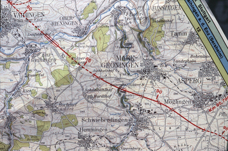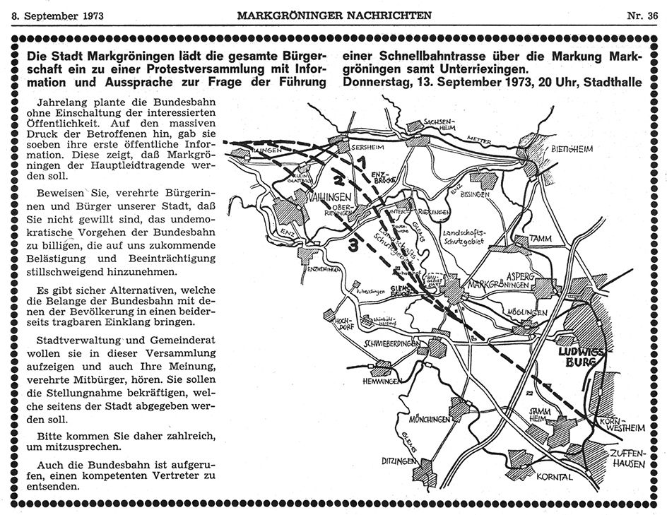 NBS-Planung Aufruf der Stadtverwaltung zur Protestversammlung in den Markgröninger Nachrichten vom 8. September 1973 – – – – – – – – Verlauf der Neubaustrecke vom Güterbahnhof Kornwestheim bis zum neuen Bahnhof in Vaihingen – – |