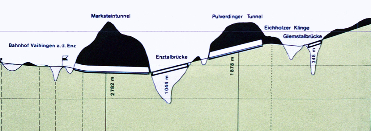 Überhöhtes Streckenprofil vom Bahnhof Vaihingen bis aufs Lange Feld |