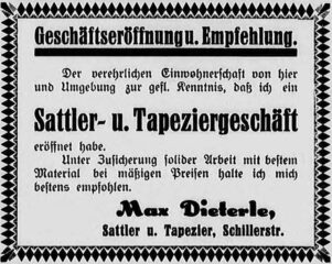 Links: Anzeige in der Markgröninger Zeitung anlässlich der Eröffnung des Sattler- und Tapeziergeschäfts von Max Dieterle im Januar 1926 Quelle: Stadtarchiv MG– –