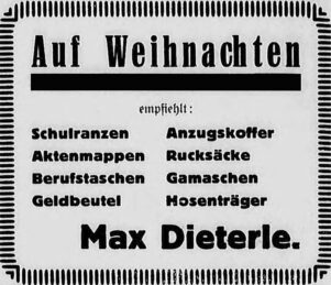 Rechts: Anzeige von Sattler Max Dieterle in der Markgröninger Zeitung Nr. 289 im Dezember 2026 Quelle: Stadtarchiv MG