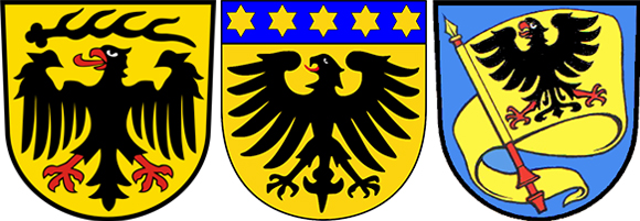 Herzog Eberhard im Bart mit Reichssturmfahne im Markgröninger Rathaus (Ausschnitt) Herzogswappen mit Reichssturmfahne, 1544 am neu erstellten Pfarrhaus angebracht, und Version von 1594 mit drei Helmzierden ohne Grüningen Württemberger und Gröninger Stadtswappen unter dem Uhrturm des Rathauses (vor 1705). Die Sterne im Stadtwappen waren im 19. Jh. noch nicht ergänzt. Banner des Heiligen Römischen Reichs und Wappen der Grafen von Grüningen und Württemberg (zum Erzbannerstreit mit Braunschweig 1695 zusammengestellt)