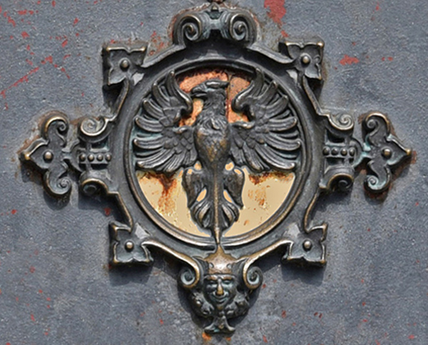 Wappen Graf Ulrichs III. mit Helmzier und Reichssturmfahne,. Daneben der Graf mit der Reichssturmfahne auf dem Stauferlöwen