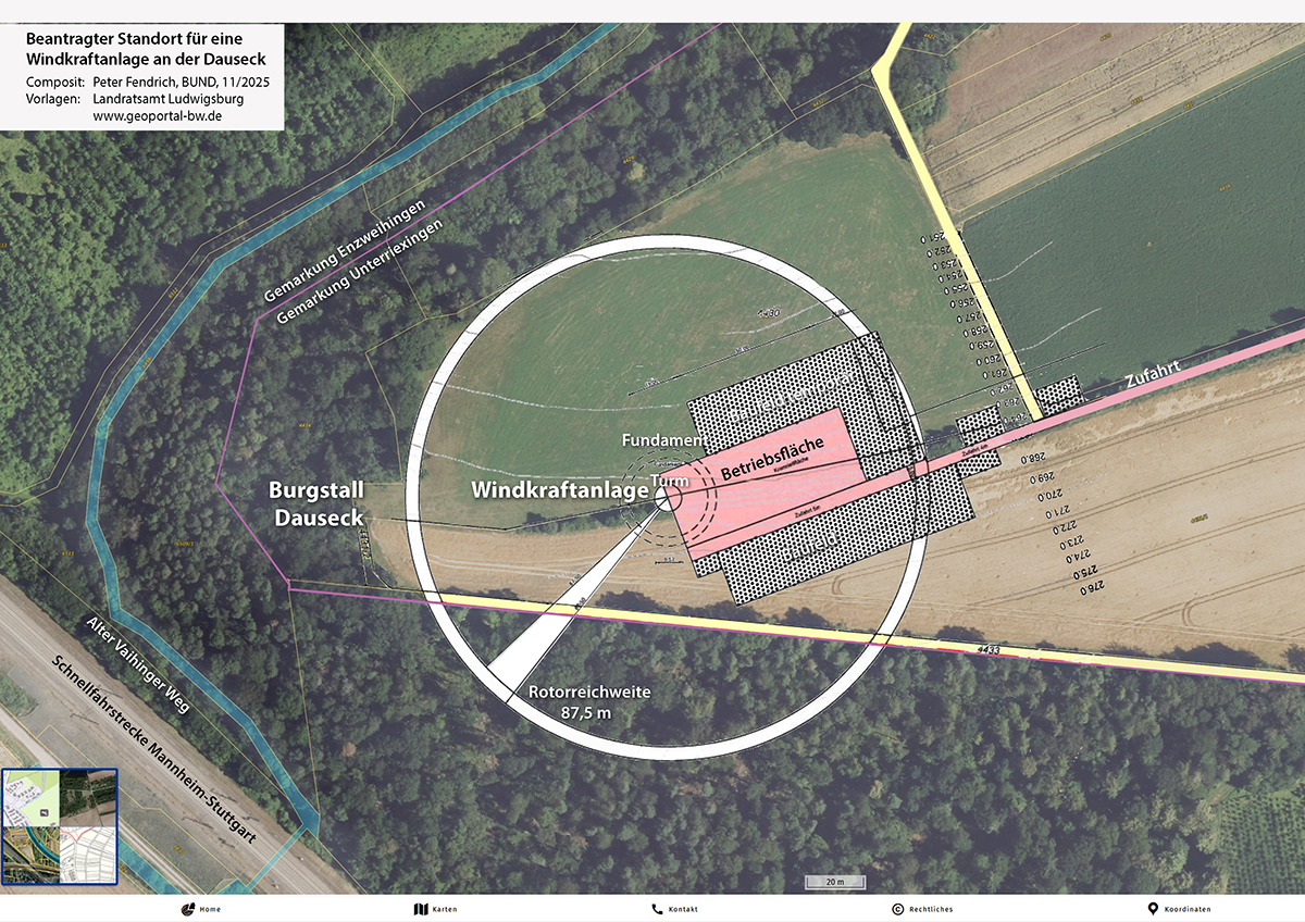 Östlich vom Burgstall der Dauseck wurde die Erstellung einer großen Windkraftanlage mit über 80 Meter langen Rotorblättern beantragt [PDF].