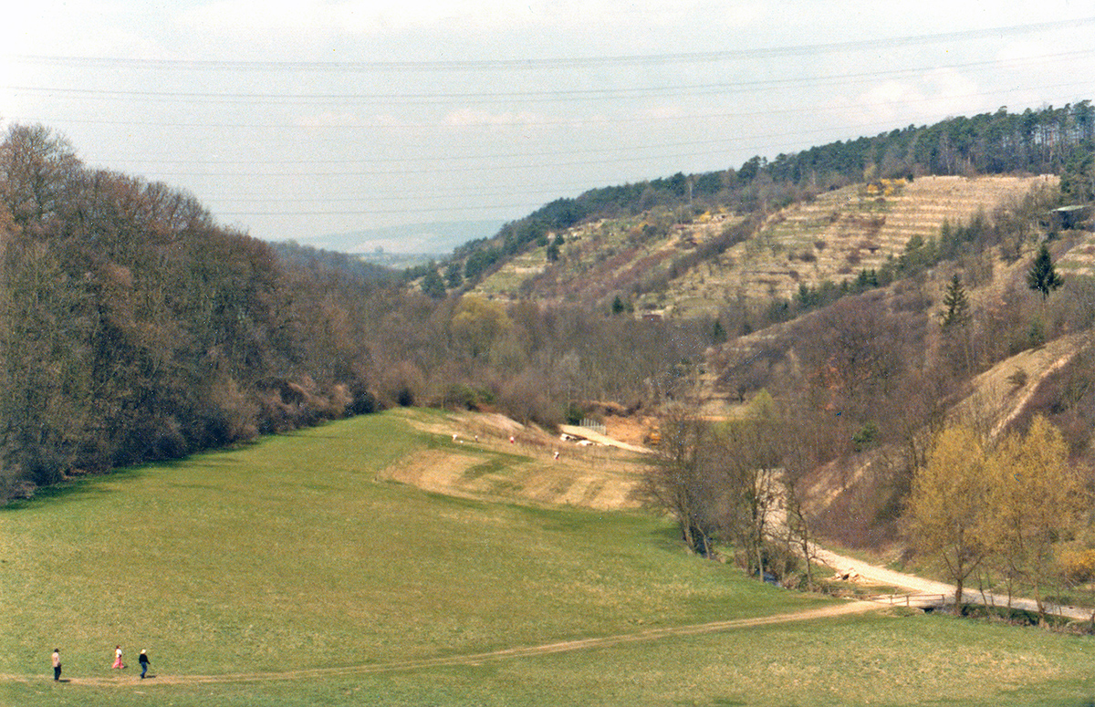 Leudelsbachtal um 1963 von Südosten: Im Vordergrund Bissinger Pfad, dahinter Erschließung für das Gruppenklärwerk Leudelsbach |