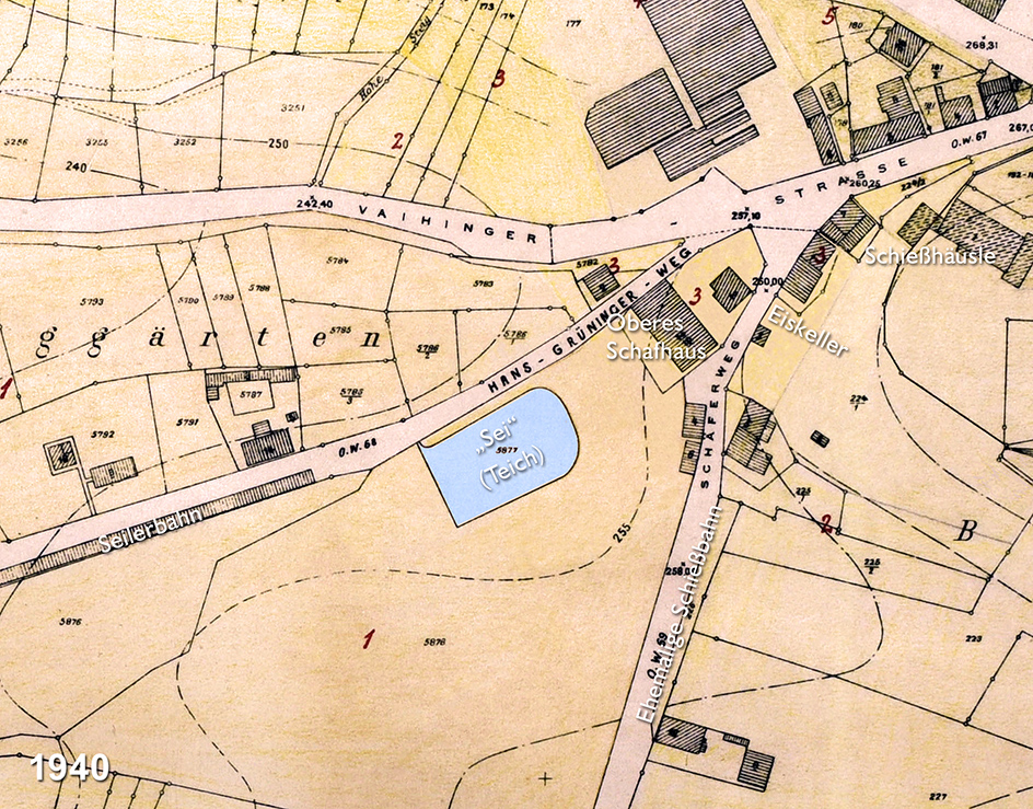 „Sei” unterm Gewann Schießmauer in den 1940er Jahren von Nordosten. Der Teich vor dem Verwaltungsgebäude der Fima Näher diente einst als Eisteich und als Ziel der „Gans-Marie”. Er wurde um 1950 trockengelegt und überbaut